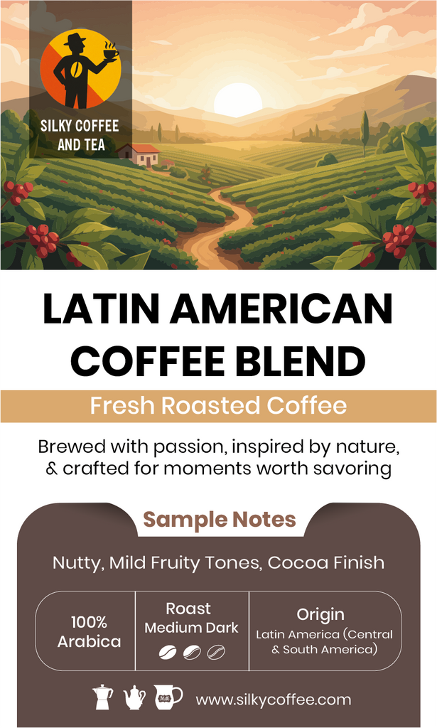 A medium-dark roast of select Latin American coffees perfectly blended for full flavor, offering nutty hints with mild fruity tones and a gentle cocoa aftertaste. Shade grown in the Central American rain forests and in volcanic soil near the Amazon rain forest, these blended coffees make a rich, delicious cup. Environmentally friendly washed processing and full sun dried for up to 7 days.